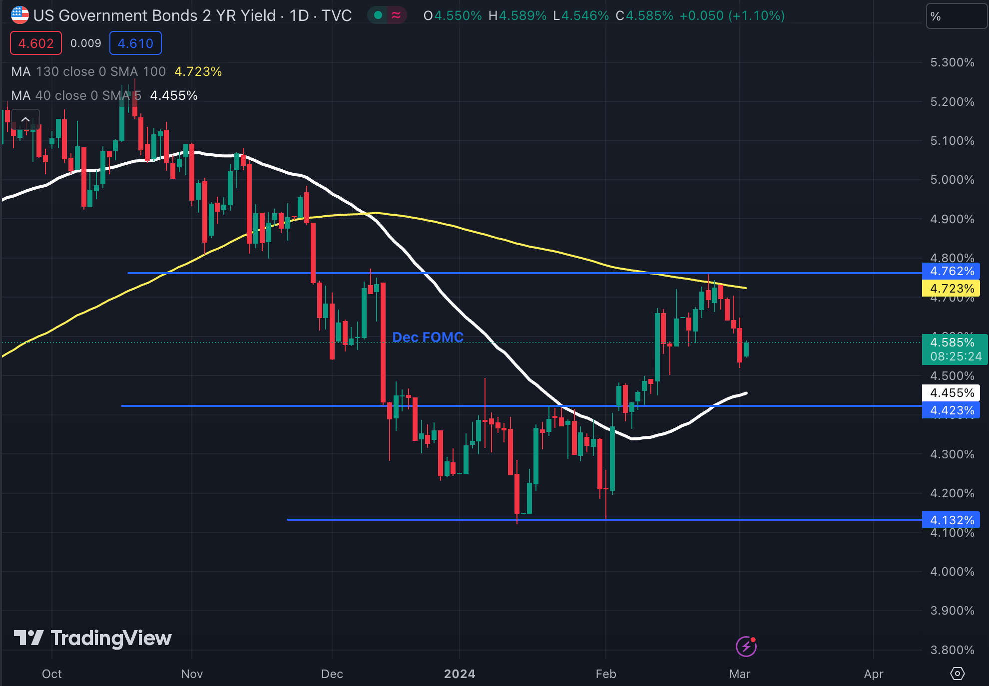 The week kicked off with the ISM Manufacturing Index, marking the start of a critical period for economic indicators. As anticipated, yields retreated after encountering resistance at the US 2YR @ 4.75%, a level aligned with expectations for three rate cuts within the year.